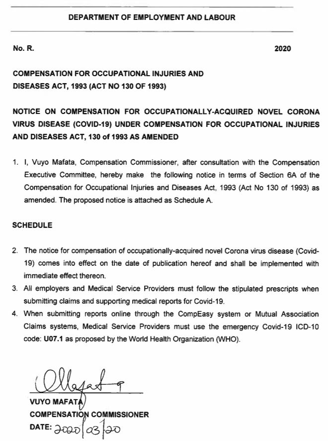 Notice on Compensation for Occupationally - Acquired COVID-19 disease under COIDA