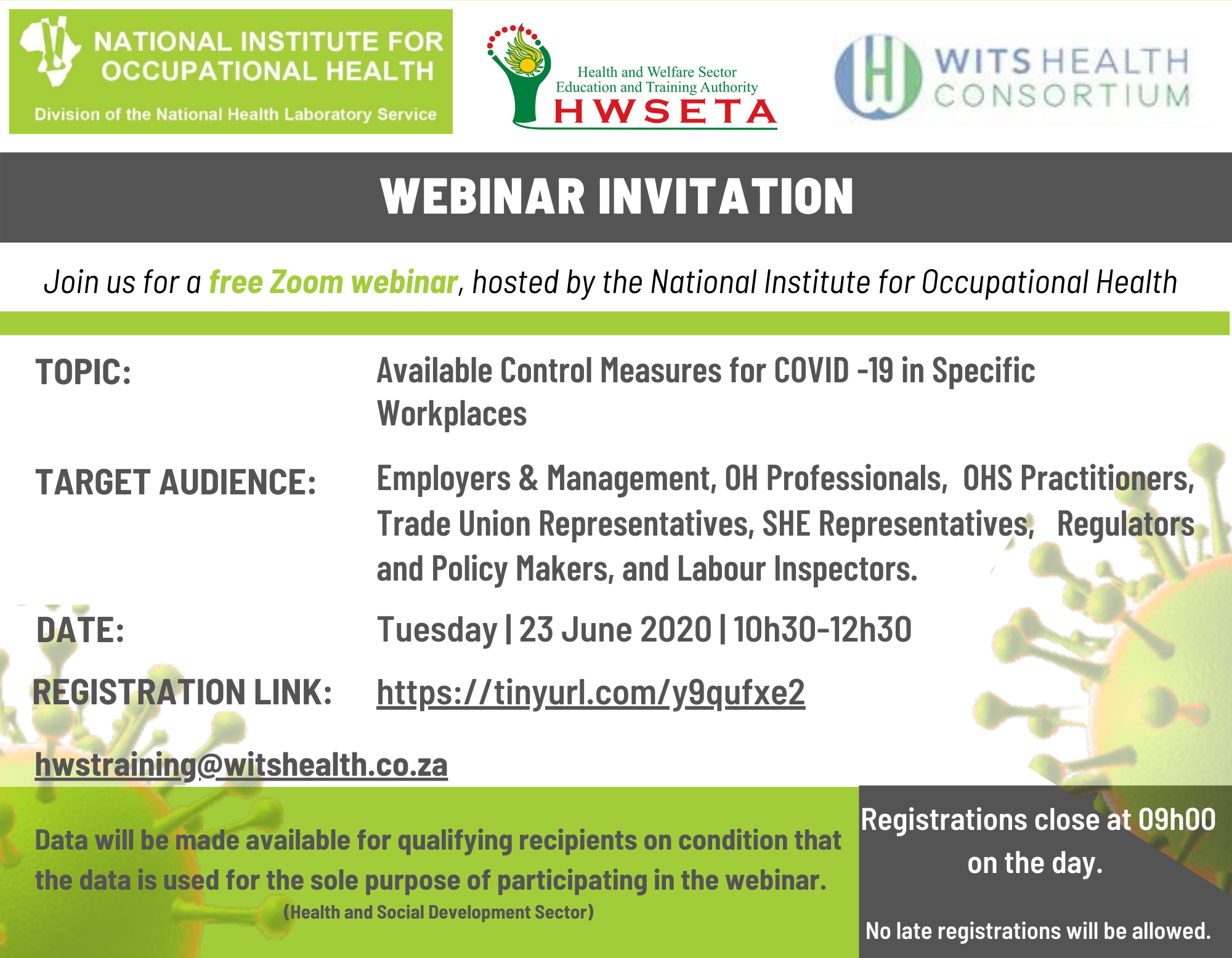 The National Institute for Occupational Health (NIOH) invites you to a free training webinar session for Employers & Management, OH Professionals, OHS Practitioners, Trade Union Representatives, SHE Representatives, Regulators and Policy Makers, and Labour Inspectors on Available Control Measures for COVID -19 in Specific Workplaces, Tuesday, 23 June 2020 at 10:30-12:30.   Registration:   Registration is required in order to access the session.   The Health and Welfare Seta has made funding available for COVID-19 education for employees. To make sure the funds are applied as per the mandate, we are required to collect certain information at each training intervention. Your personal information will not disseminated to parties outside of the Health and Welfare SETA and Wits Health Consortium.    The webinar link and information will be send prior to the webinar.