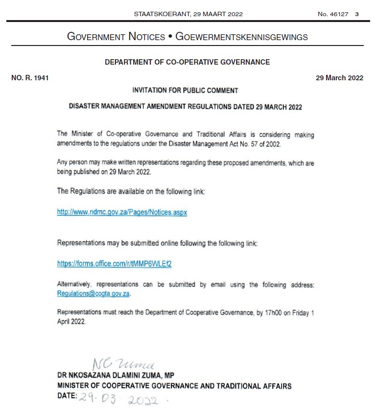 Disaster Management Amendment Regulations Dated 29 March 2022 - Public Comment