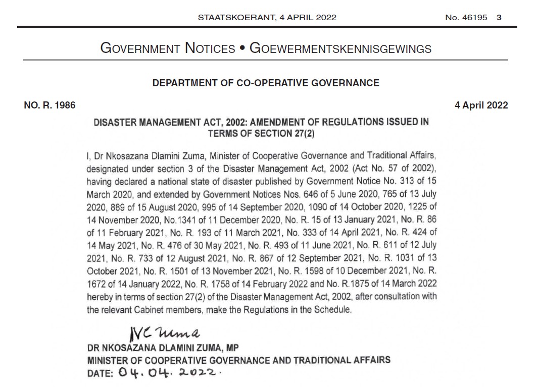 Disaster Management Act (57/2002): Amendment of Regulations Issued in terms of Section 27 (2)