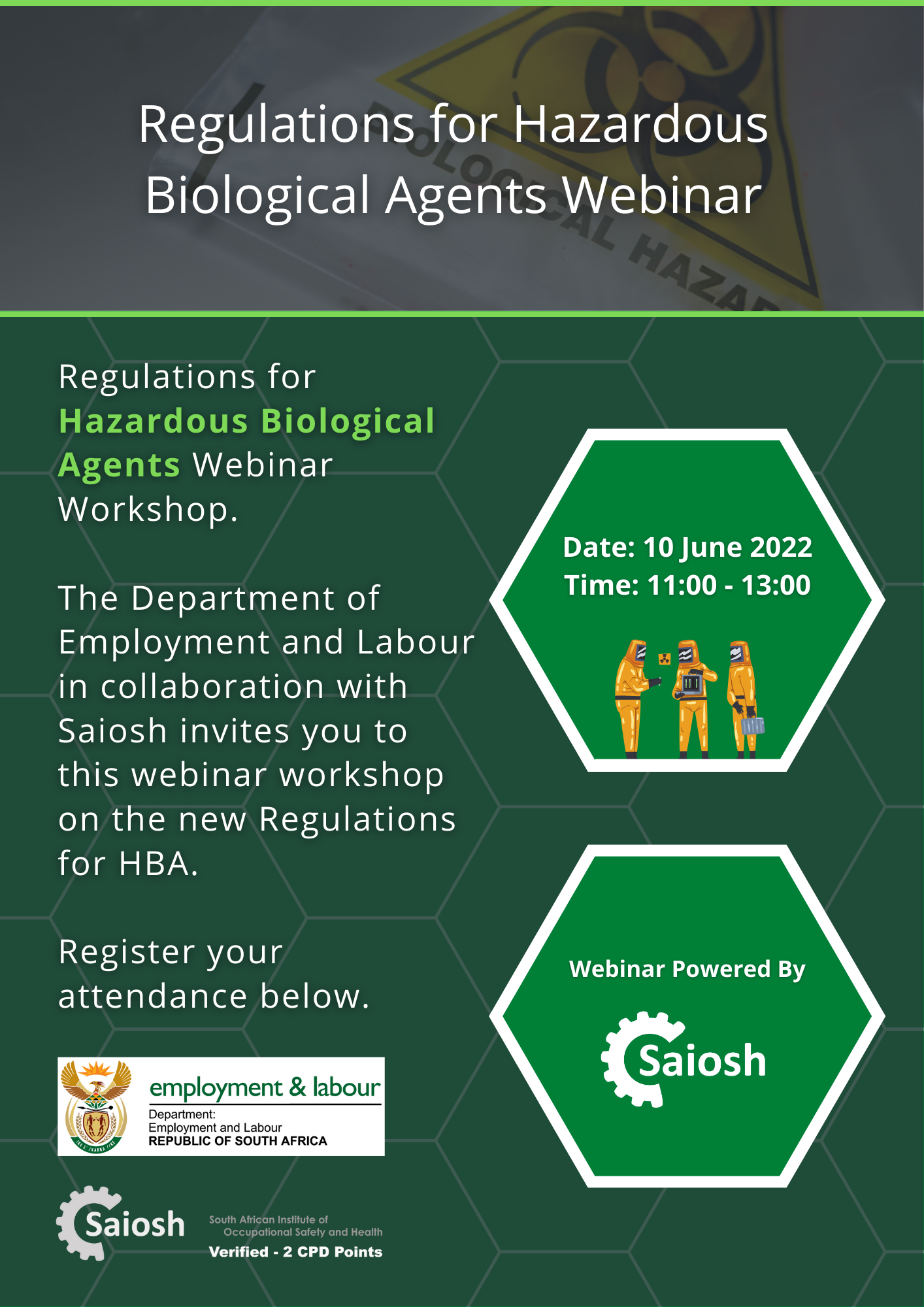 | REMINDER: Department of Employment and Labour Webinar Powered by Saiosh on the new HBA RegulationsThursday, 09 June 2022