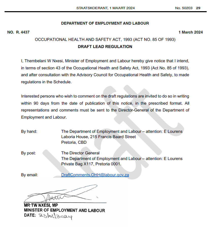 Occupational Health and Safety Act, Draft Lead Regulations for Public Comment