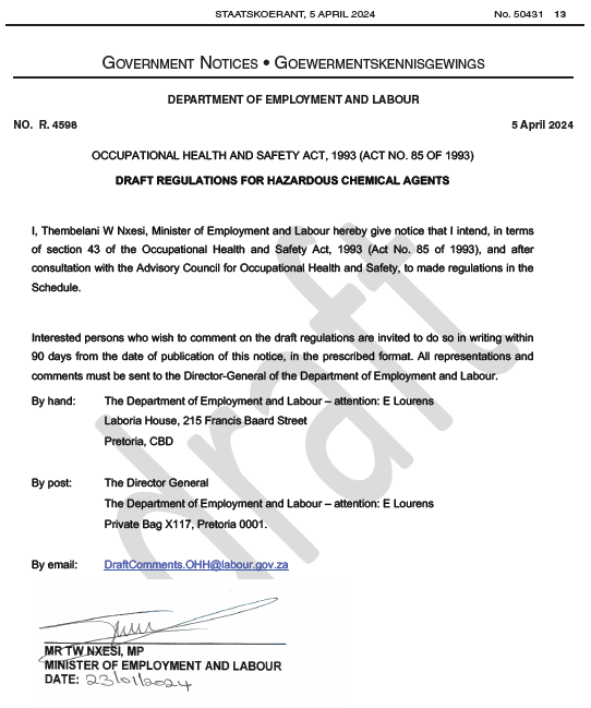 Occupational Health and Safety Act, Draft Regulations For Hazardous Chemical Agents - Public Comment