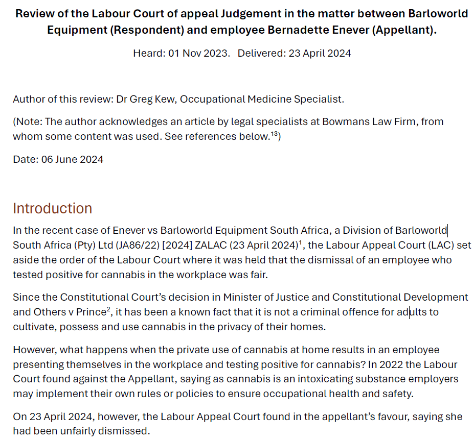 Review: Labour Appeal Court Case - Cannabis use and Workplace Cannabis Testing