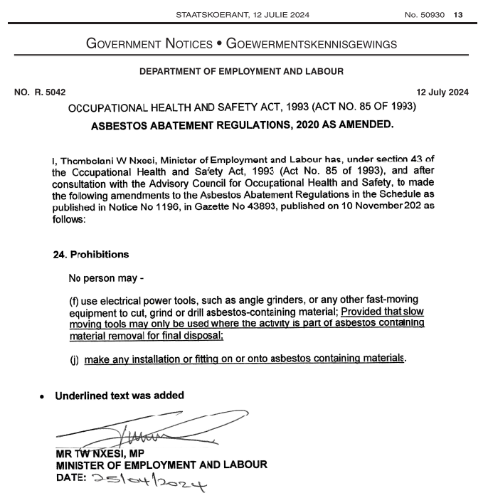 Occupational Health and Safety Act, Amendment of Asbestos Abatement Regulations, 2020