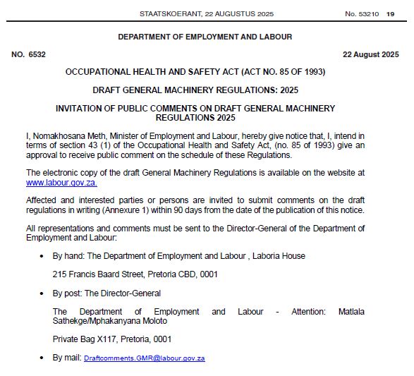 Occupational Health and Safety Act: Regulations: General Machinery: Comments invited | South African